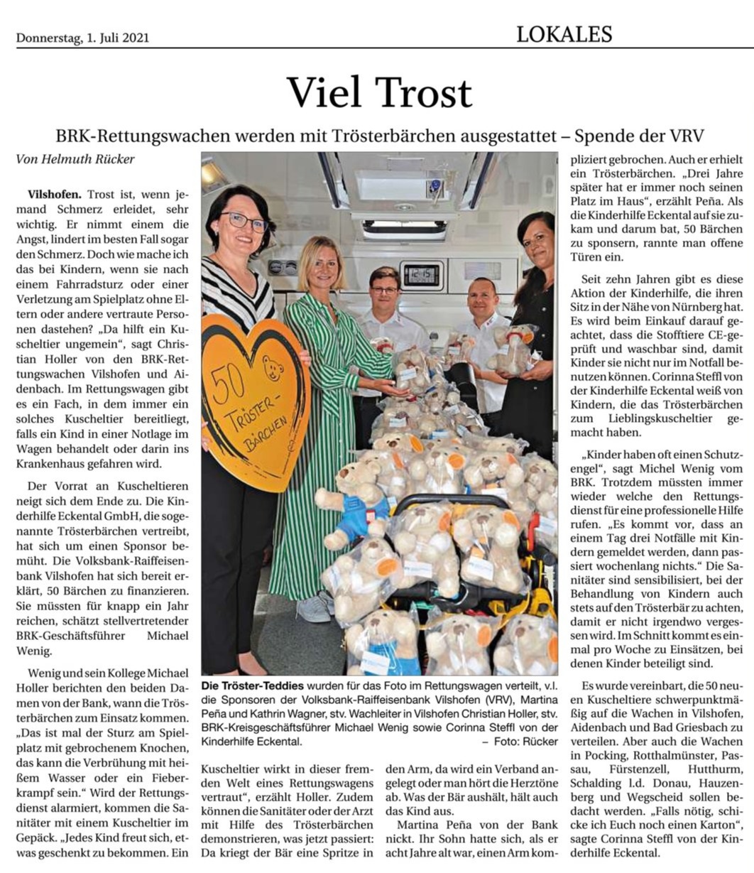 Vielen herzlichen Dank an die Volksbank-Raiffeisenbank Vilshofen, durch ihre Hilfe konnten dem BRK 50 Trösterteddys ausgeliefert werden.